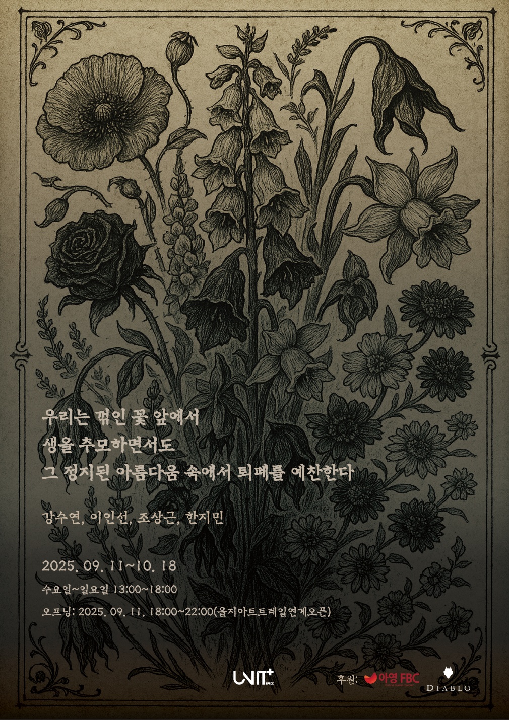 - 스페이스유닛+, 《우리는 꺾인 꽃 앞에서 생을 추모하면서도 그 정지된 아름다움 속에서 퇴폐를 예찬한다》, 서울시 중구 을지로 143, 1F